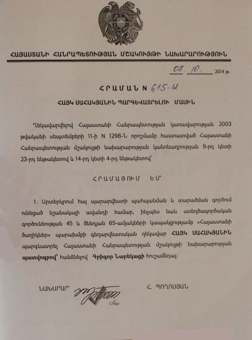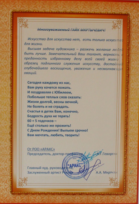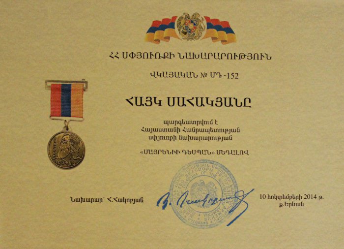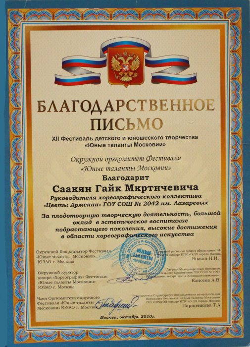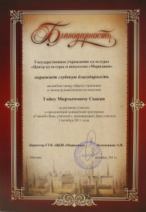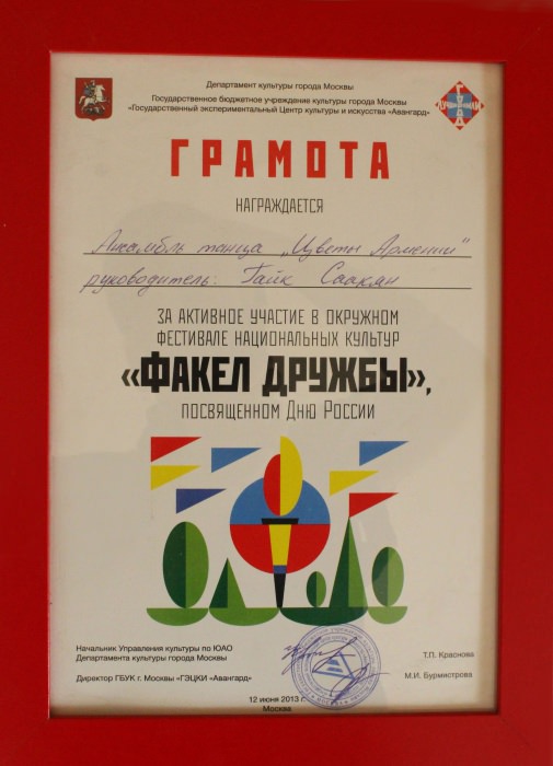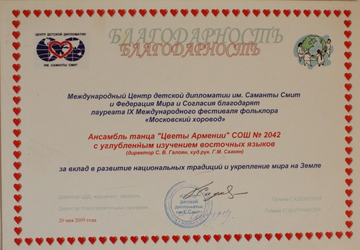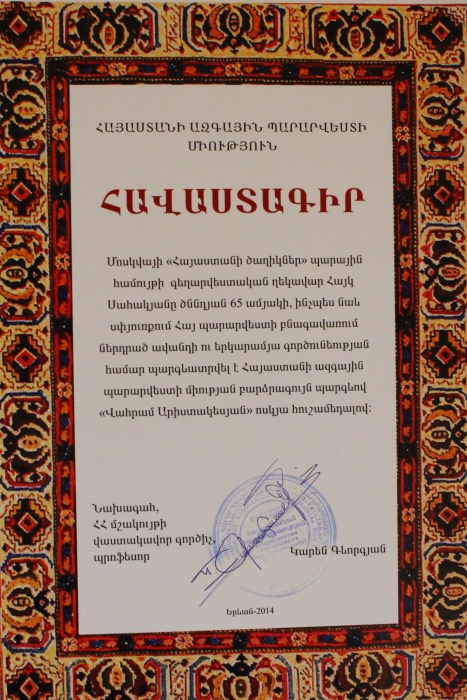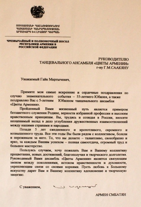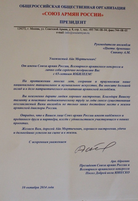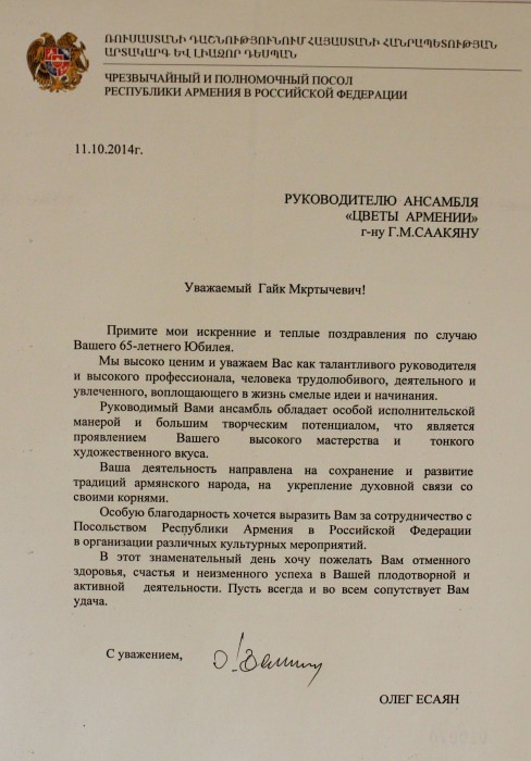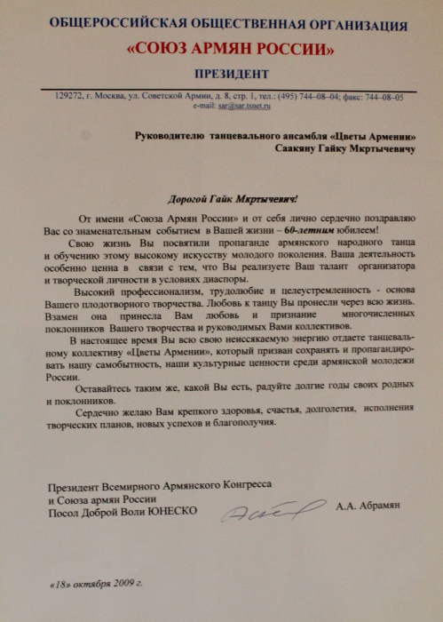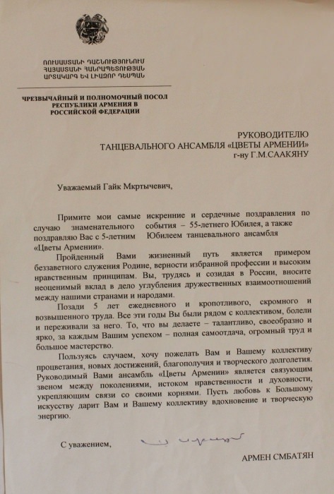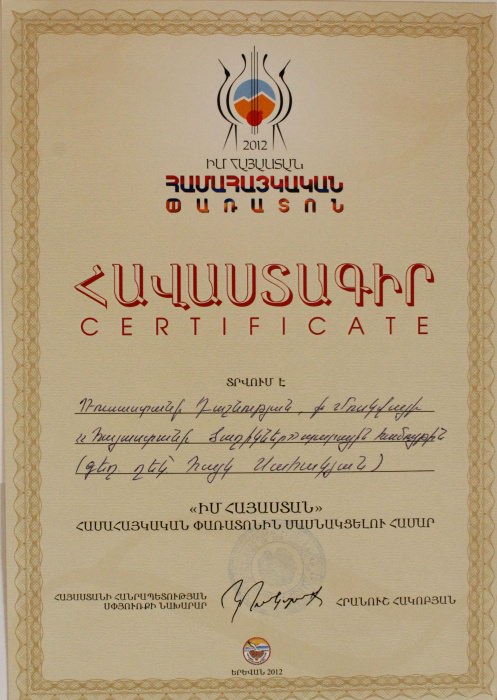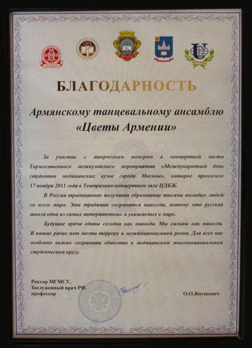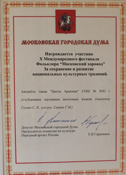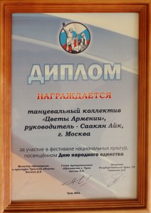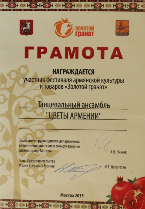 Ансамбль «Цветы Армении» является лауреатом I и II степеней окружных, областных, всесоюзных, всероссийских и международных фестивалей и конкурсов, имеет на своем счету множество государственных наград, межправительственных премий, благодарственных писем и почётных грамот.